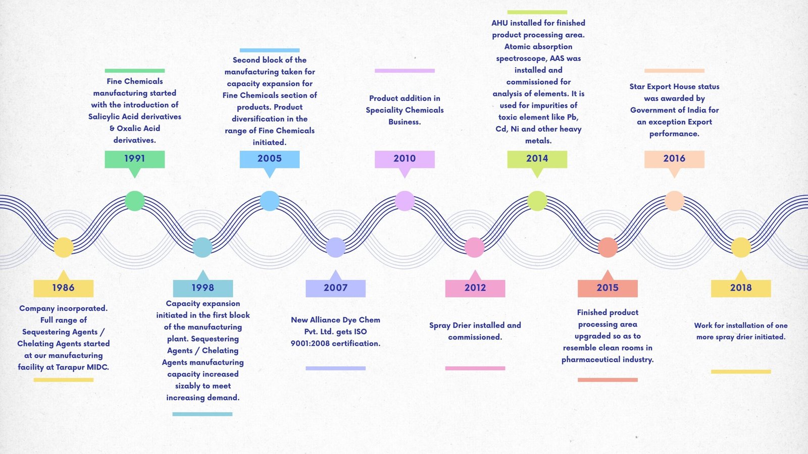 New Alliance Dye Chem Pvt. Ltd. was founded in the 1980s with two key business units – Sequestering Agents / Chelating Agents & Fine Chemicals. The Sequestering Agents business remains our core business with a range of products to offer. Today, with Water Treatment business and Specialty Chemicals, we have a diversified product basket to offer to our valued customers.
